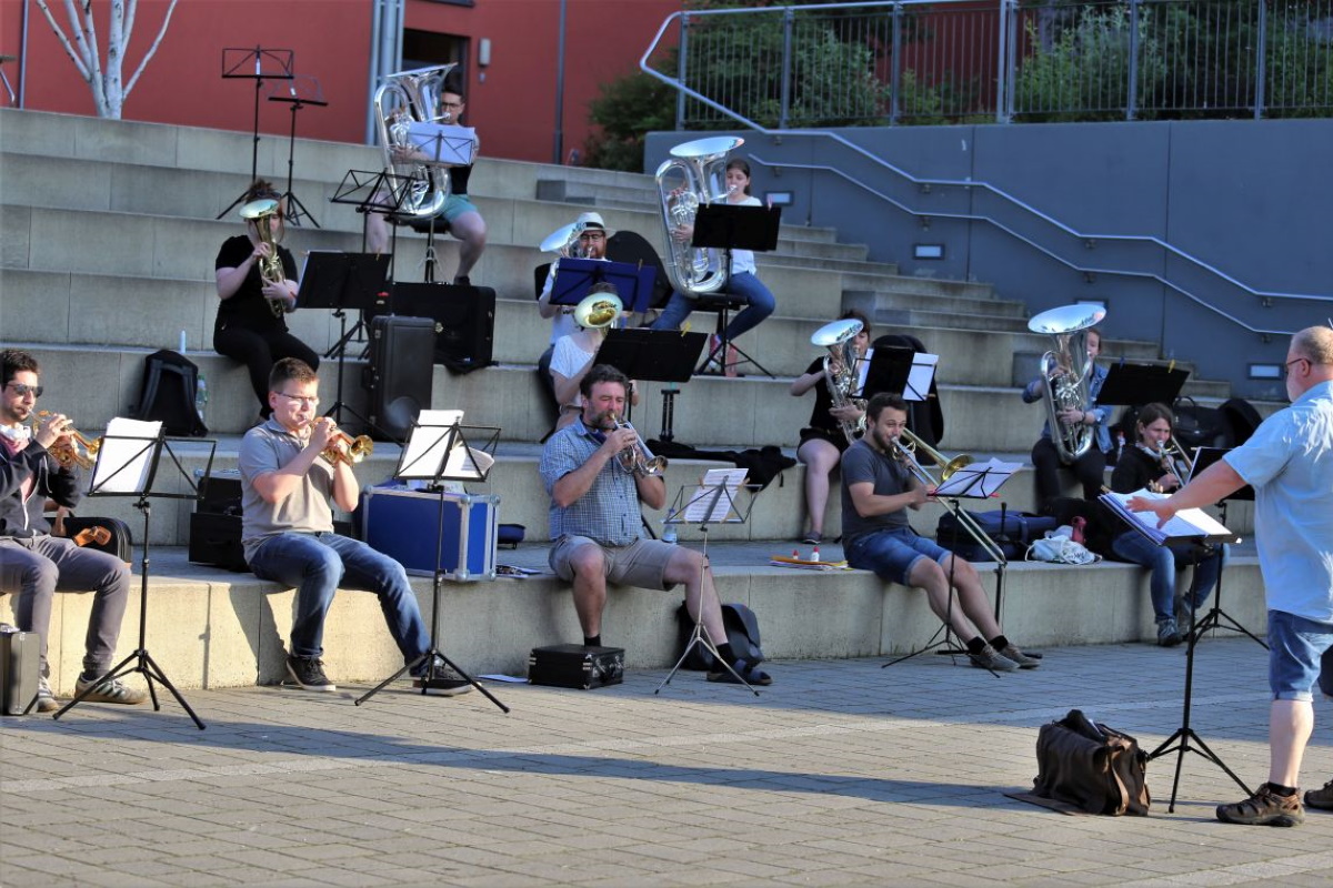 Die Begeisterung über die erste gemeinsame Probe nach so langer Zeit war uns allen förmlich ins Gesicht geschrieben. Dazu kamen wir im Hof der Saaletalschule in Lobeda-West zusammen, die uns ihr Gelände dankenswerter Weise auch zukünftig zur Verfügung stellt. Hier gibt es neben einer durchaus beeindruckenden Akustik vor allem ausreichend Platz, damit wir die strengen Hygiene-Auflagen des Fachdienstes Gesundheit der Stadt Jena einhalten können. Die großzügigen Steinstufen ermöglichen zudem freie Sicht auf unseren dann doch recht entfernt stehenden Dirigenten. Nach der gelungenen Premiere sollen übrigens auch unsere Kolleg*innen der Show Brass Band VielKLANG und der Jugend Brass Band BlechKLANG wieder in die Probenarbeit einsteigen.