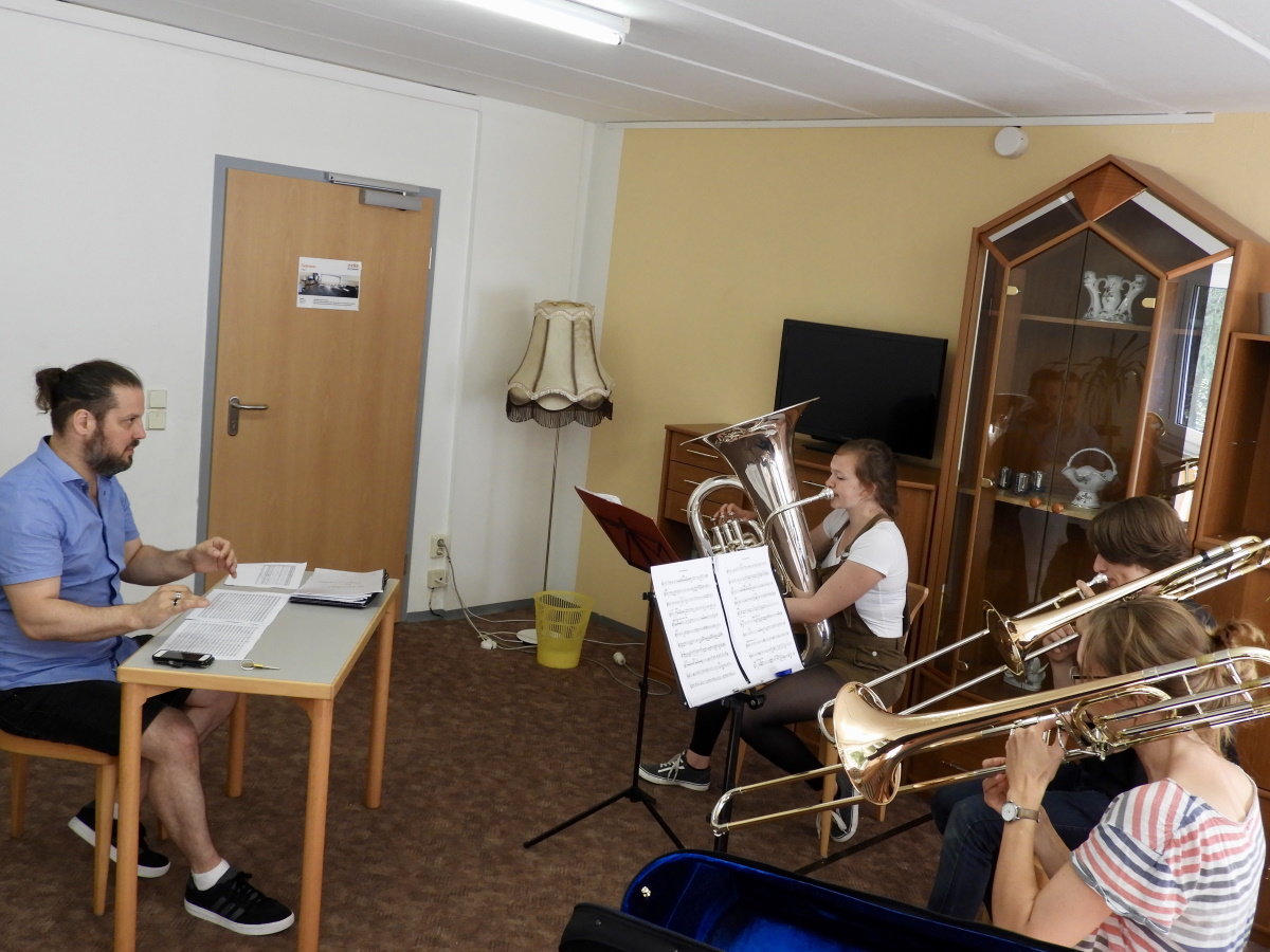 Beginnend mit einem gemeinsamen Warm-Up, an welches sich eine spezielle Probeneinheit zum Thema Technik anschloss und endend mit der Einstudierung von Kammermusik hatte bereits jeder Vormittag eine feste Struktur. Am Nachmittag ging es dann mit Register- und danach mit Gesamtproben weiter. Auch am Abend gab es keine Pause für die Band! Bis ca. 21 Uhr wurde fleißig an dem sehr anspruchsvollen Material gearbeitet. Zwischendurch bestand selbstverständlich immer wieder Raum, mit den Dozent*innen individuelle Fragen zu Technik, Ansatz, Klang etc. zu klären. Am Freitag (16. August 2019) gab es zudem einen umfassenden Workshop, gehalten von Instrumentenbauer Matthias Vogt, zum Thema Pflege und Reinigung.