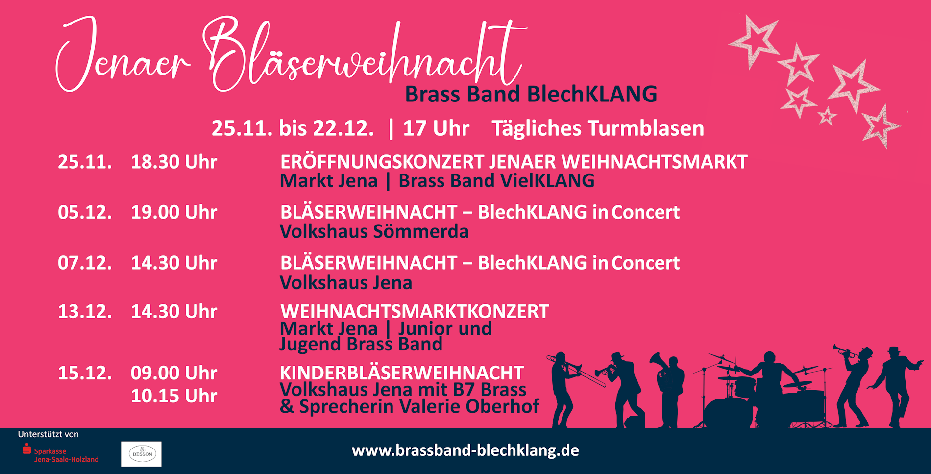 - 13.12.2025, 14:30 Uhr, Weihnachtskonzert von Junior Brass Band KLANGwelt und Jugend Brass Band BlechKLANG auf dem Jenaer Weihnachtsmarkt (Leitung: Andrea Hobson)